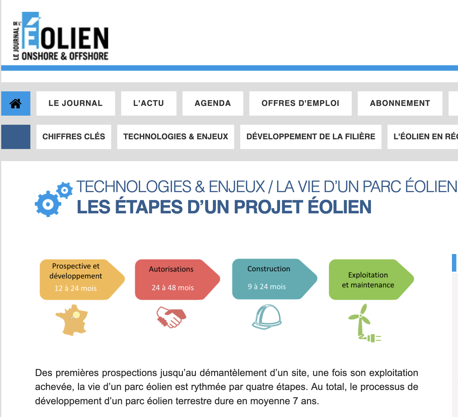 * Données pour la France. Le Journal de l'Éolien. Les étapes d’un projet éolien. Consultée le 17/12/25