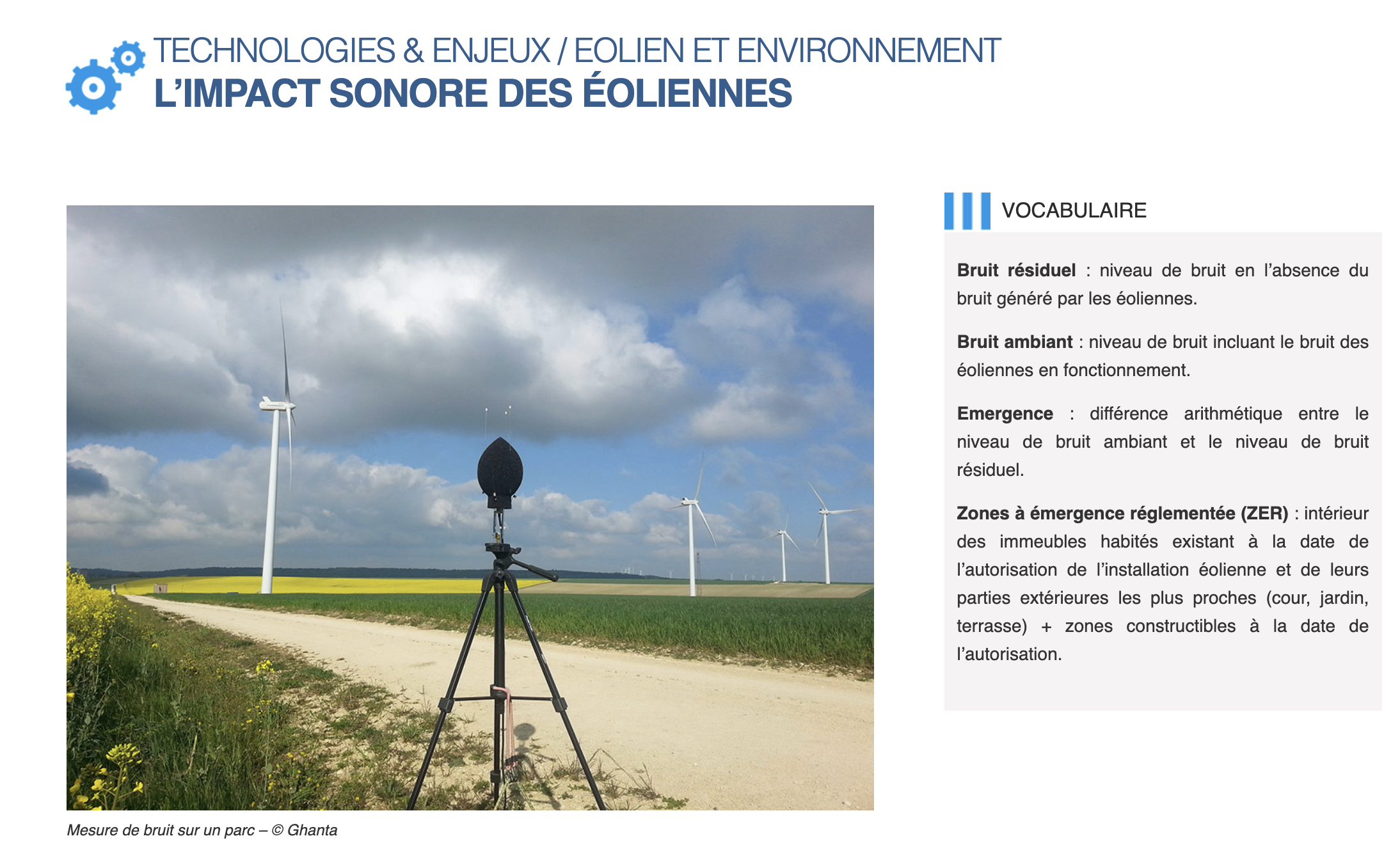 La réglementation impose une distance minimum de 500 mètres des habitations3 et interdit un bruit additionnel au bruit ambiant de plus de 5 décibels le jour et de 3 décibels la nuit4. Cela doit être vérifié par des mesures avant et après l’installation des éoliennes.